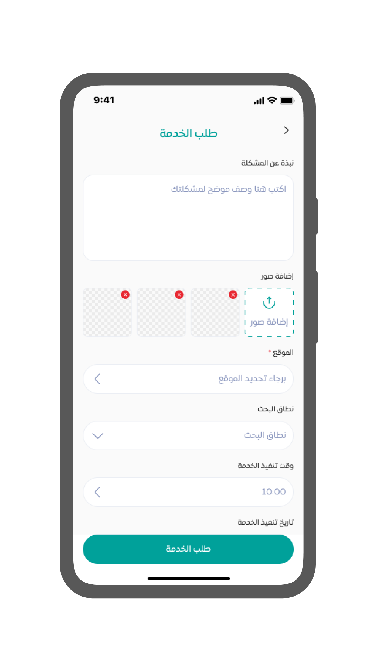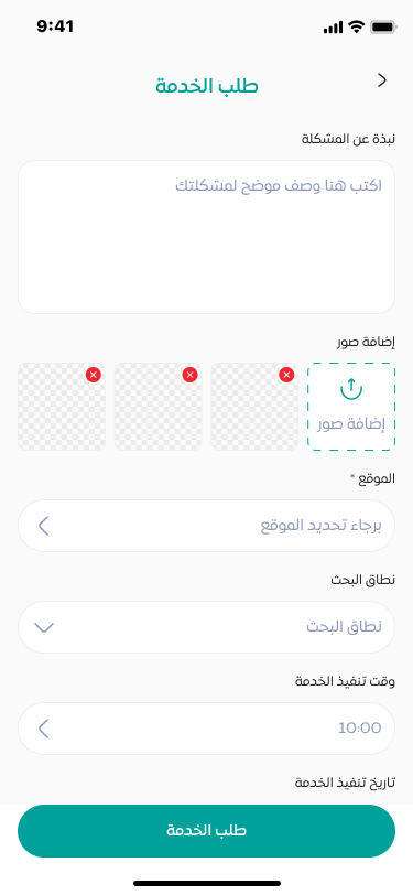 املأ بيانات الطلب مثل الموقع، الوقت، والملاحظات الإضافية.